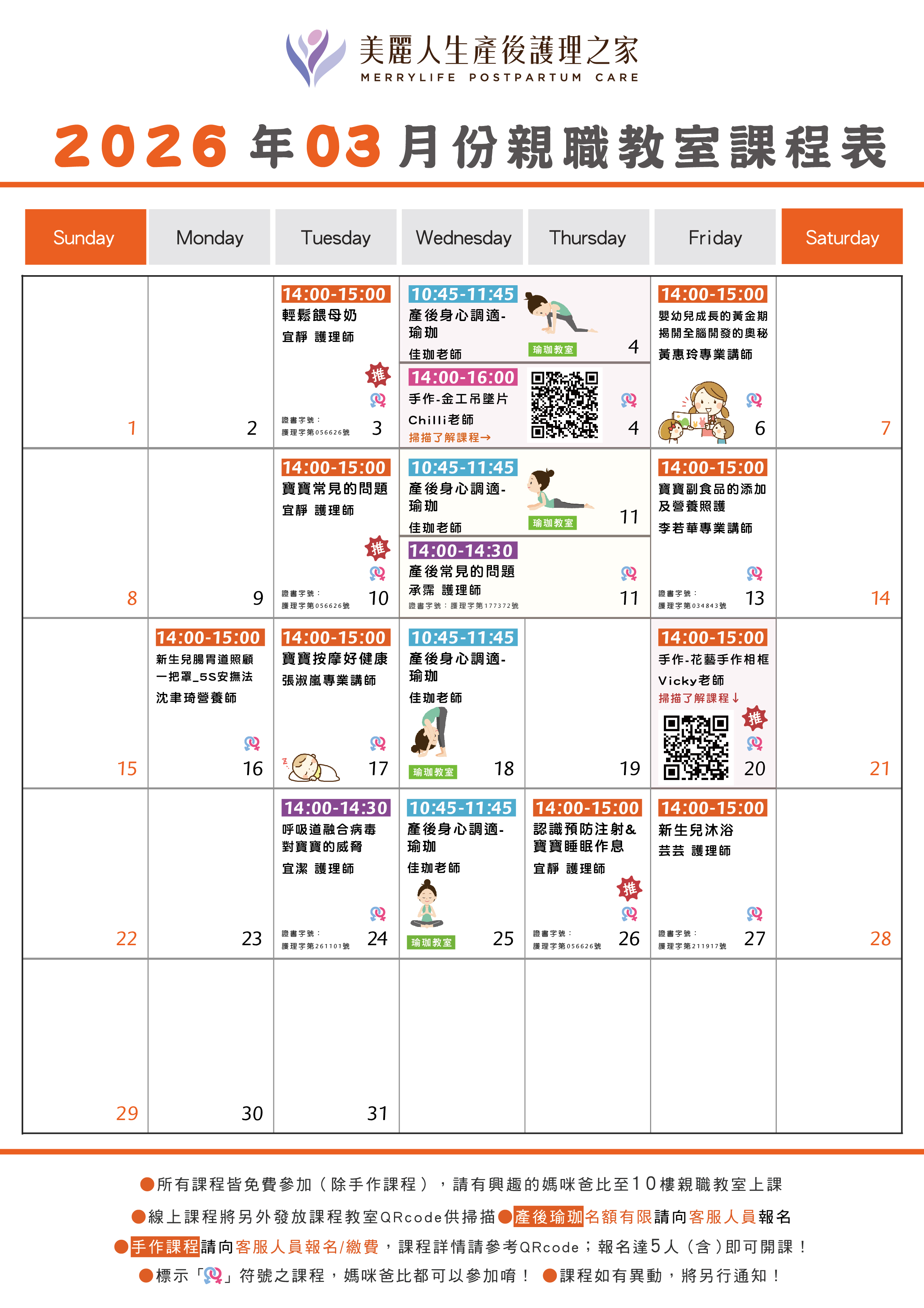 ❤ 美麗人生產後護理之家 ❤ 2026年 03月 親職課程 館內媽咪幸福多元化產後課程 提供住房媽咪的專屬活動 產後照護|哺乳技巧|嬰幼兒照護|親子共讀|產後瑜珈|手作課程 一起利用空閒時間,一同學習 豐富媽咪的產後時光