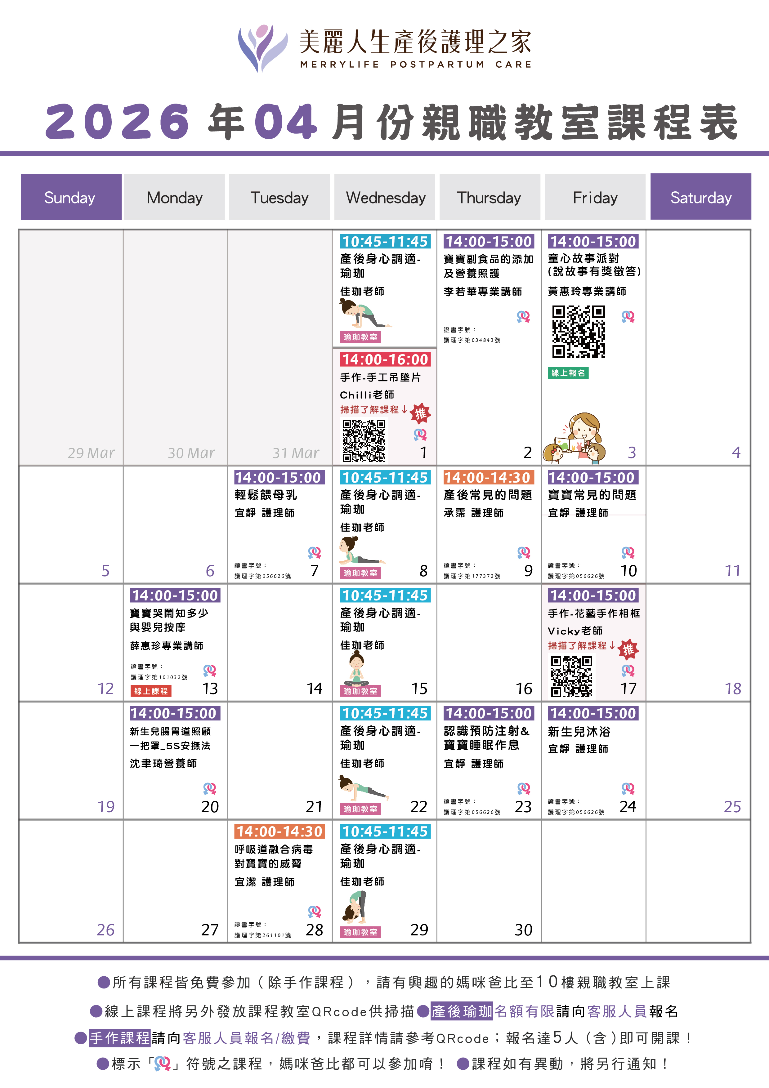 ❤ 美麗人生產後護理之家 ❤ 2026年 04月 親職課程 館內媽咪幸福多元化產後課程 提供住房媽咪的專屬活動 產後照護|哺乳技巧|嬰幼兒照護|親子共讀|產後瑜珈|手作課程 一起利用空閒時間,一同學習 豐富媽咪的產後時光